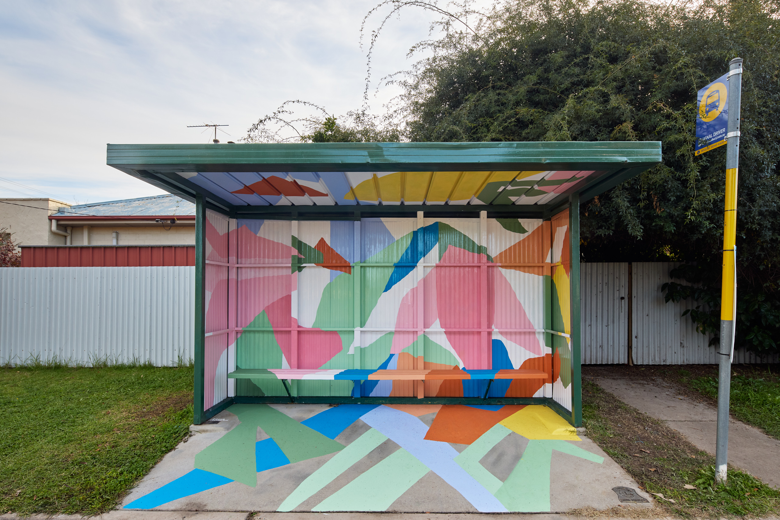 Abstracted floral mural, designed to flow across the seating, walls, ground and exterior of a North Albury Bus Shelter.