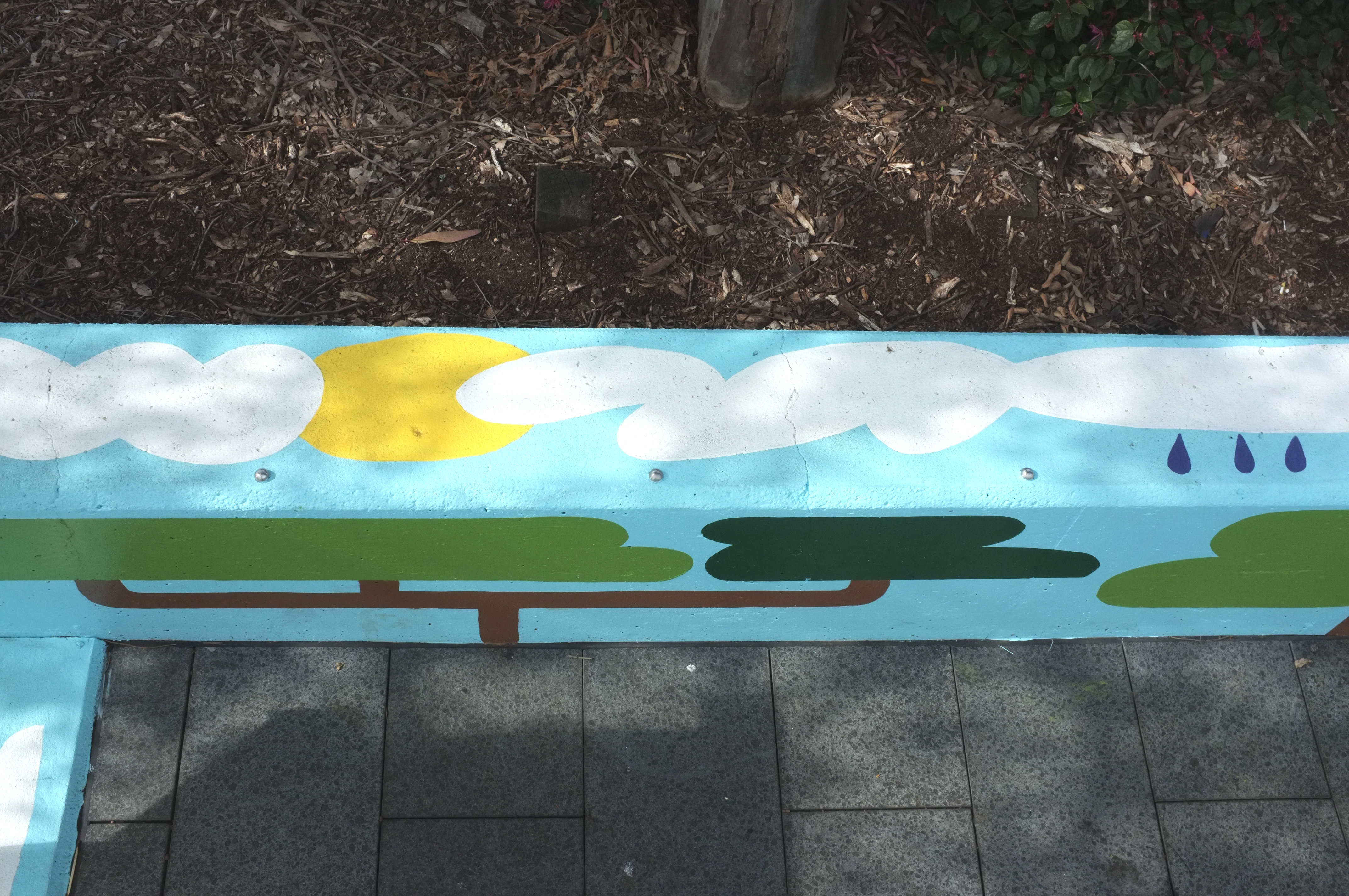 30m2 public concrete wall on main suburb street, surrounding public community benches, library box and bus stop. Painted for City of Ryde.