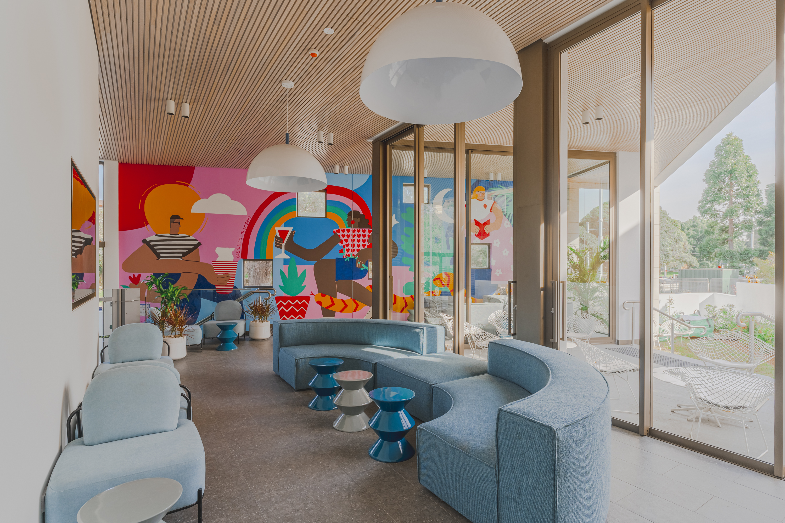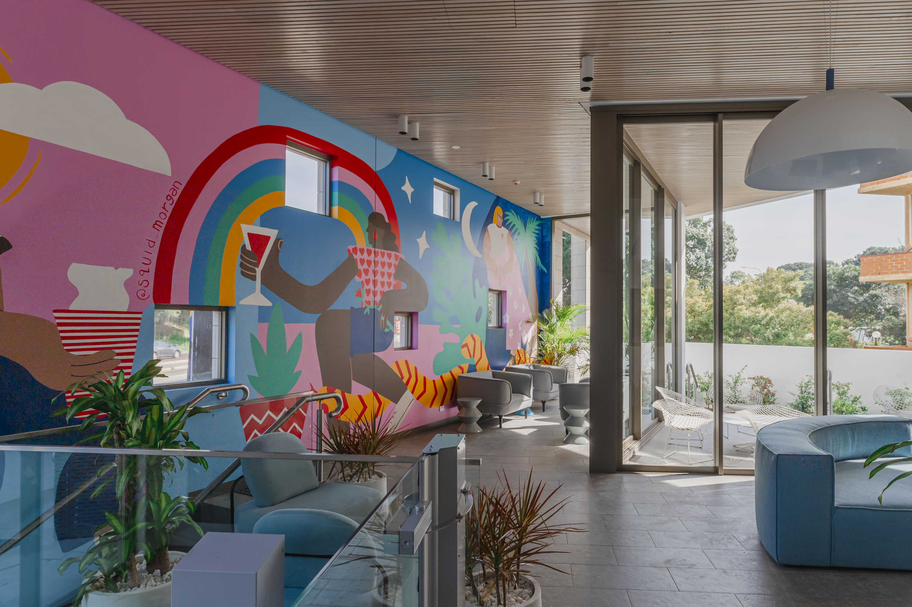 10x2m painted indoor mural for the lobby lounge of a luxury apartment building.